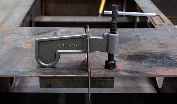This new non-welded fitting aid assists in the make-up and gapping of vertical seams, deck seams, knuckles, and other plate joints that typically require the use of dogs, wedges, fishtail jacks, or other weld-on fitting aids. Also useful in fitting and aligning pipe and rolled cans. Set includes: dog, 1/8" standard shim, and block. Parts can be ordered separately. Custom shim sizes also available.
