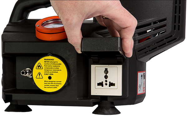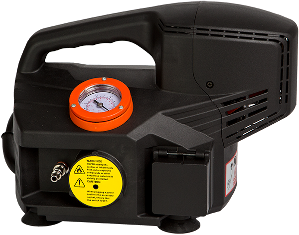 Vacuum Pump for use in conjunction with our various vacuum boxes to vacuum test weld seams. Features a regulator, quick fitting coupling, pressure gauge, warning buzzer, water filter with cartridge, auxiliary power plug, and 98" (2.5M) air hose.