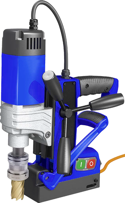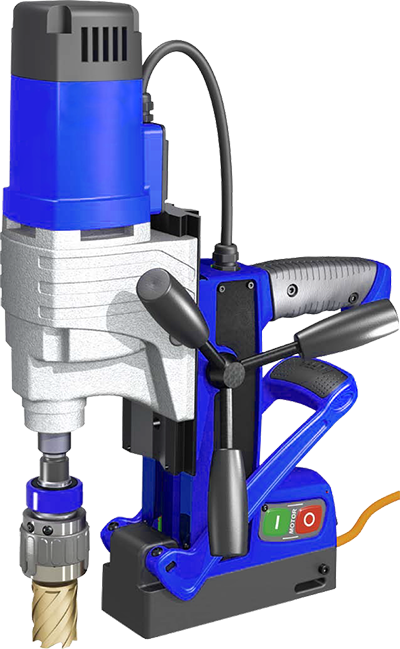 Metal core drilling machines that feature an ultra-powerful switchable permanent magnet with pre-tension, ergonomic operation, use from just 3 mm, PCB with hybrid relays, LED indicator for magnet adhesive force display, temperature sensor, and quick-change arbor.