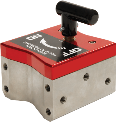 Switchable permanent rare earth Magnetic Squares are extremely powerful and eliminate the need for tedious clamping. The Magnetic Squares offer fast workholding on multiple sides for flat or round steel. Features pre-tapped holes on all sides for mounting and a locking On/Off handle for safety..