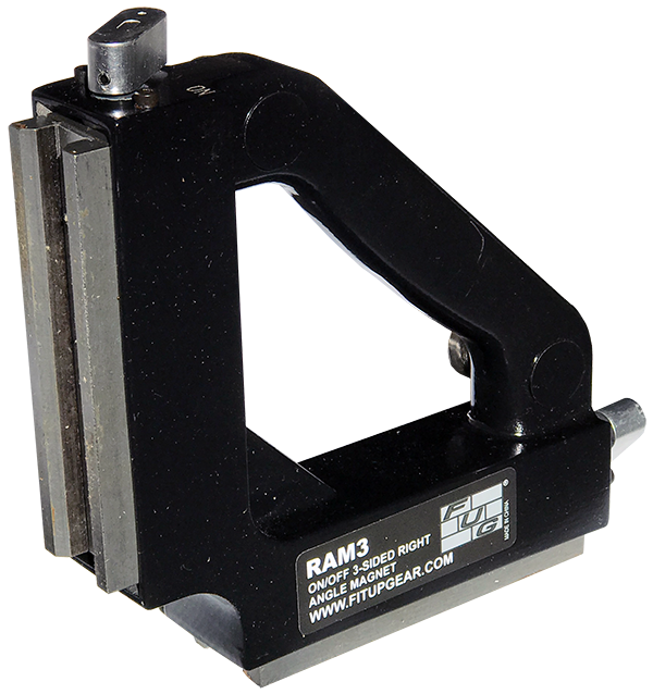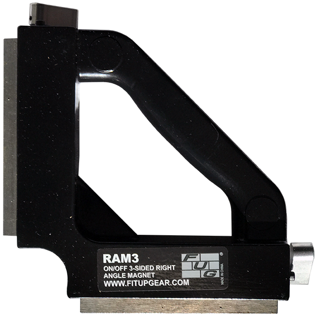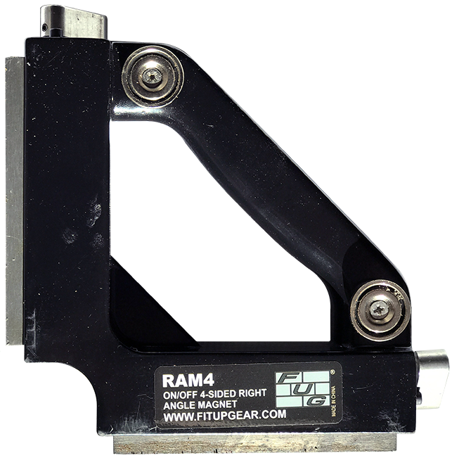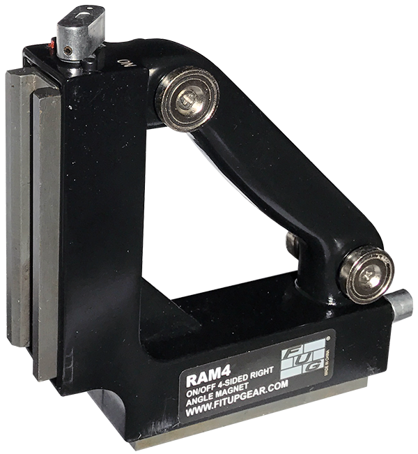 Right angle magnets for holding steel workpieces at 90°. Switchable magnets with 275 lb breakaway on main contact sides plus non-switchable auxiliary magnets flanking the handle (auxiliary magnets one side for RAM 3 – both sides for RAM 4).