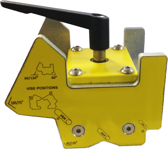 Dual function workholding angle tool and quick connect/disconnect switchable magnetic vise. Holds up to 1,000 lbs on thick steel. Features 45/135° + 60/120°+ 75/105° + 90° angles.