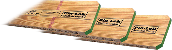In the patented Pin-Lok process, multiple structural members of Dense Select Grade lumber are milled to size. The center strip is sealed to keep out moisture and job-site chemicals and aligned for the greatest possible strength from the material. Heat-treated twist steel pins are then inserted every 22 inches along the plank's length to bond the three pieces into a single solid unit. In tests, the resulting plank resists point, center and shock loads which destroyed standard DI65 and high-grade laminated wood planking.