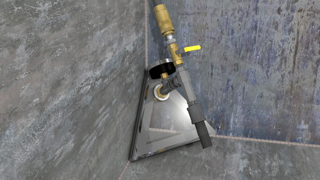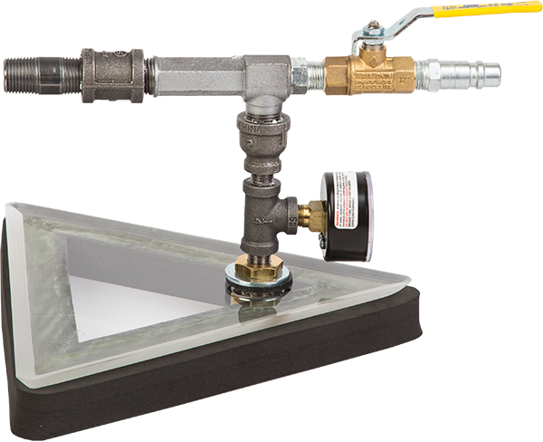 3-way inside corner vacuum box used for leak testing in building of ships, barges, tanks, or any seal weld application. Designed to be used on 3-way inside corners, our double-sided gasket design ensures a good seal during the vacuum test. Vacuum pump or compressed air source can be used.