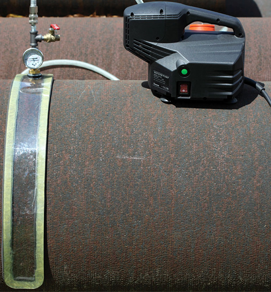 Used for leak testing in building of ships, barges, tanks, or any seal weld application. Designed for use on pipe or any concave or convex surface. Double-sided gasket design ensures a good seal during vacuum test. Vacuum pump not included. Vacuum pump or compressed air source can be used.